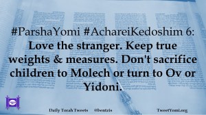 #ParshaYomi #AchareiKedoshim 6: Love the stranger. Keep true weights & measures. Don’t sacrifice children to Molech or turn to Ov or Yidoni.