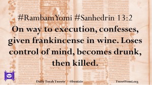 #RambamYomi #Sanhedrin 13:2 On way to execution, confesses, given frankincense in wine. Loses control of mind, becomes drunk, then killed.