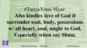 #TanyaYomi 9Iyar: Also kindles love of God if surrender soul, body, possessions w/ all heart, soul, might to God. Especially when say Shma.
