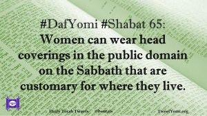 DafYomi, Shabat #DafYomi #Shabat 65 Date: May 11, 2020Author: ysspitz #DafYomi #Shabat 65: Women can wear head coverings in the public domain on the Sabbath that are customary for where they live. Share this: Share on X (Opens in new window) X Share on Facebook (Opens in new window) Facebook Like Loading... Related