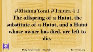#MishnaYomi #Tmura 4:1 The offspring of a Hatat, the substitute of a Hatat, and a Hatat whose owner has died, are left to die.