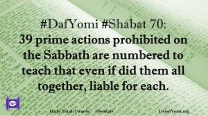 DafYomi, Shabat #DafYomi #Shabat 70 Date: May 15, 2020Author: ysspitz #DafYomi #Shabat 70: 39 prime actions prohibited on the Sabbath are numbered to teach that even if did them all together, liable for each. Share this: Share on X (Opens in new window) X Share on Facebook (Opens in new window) Facebook Like Loading... Related
