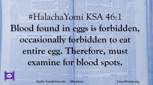 #HalachaYomi KSA 46:1 Blood found in eggs is forbidden, occasionally forbidden to eat entire egg. Therefore, must examine for blood spots.