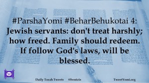 #ParshaYomi #BeharBehukotai 4: Jewish servants: don’t treat harshly; how freed. Family should redeem. If follow God’s laws, will be blessed.
