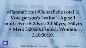 #ParshaYomi #BeharBehukotai 6: Vow person’s “value”: Ages: 1 mnth-5yrs; 5-20yrs; 20-60yrs; >60yrs = Men: 5;20;50;15 shkl. Women: 3;10;30;10.