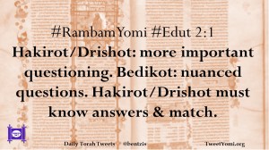 #RambamYomi #Edut 2:1 Hakirot/Drishot: more important questioning. Bedikot: nuanced questions. Hakirot/Drishot must know answers & match.