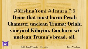 #MishnaYomi #Tmura 7:5 Items that must burn: Pesah Chametz; unclean Truma; Orlah; vineyard Kilayim. Can burn w/ unclean Truma’s bread, oil.