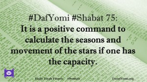 DafYomi, Shabat #DafYomi #Shabat 75 Date: May 21, 2020Author: ysspitz #DafYomi #Shabat 75: It is a positive command to calculate the seasons and movement of the stars if one has the capacity. Share this: Share on X (Opens in new window) X Share on Facebook (Opens in new window) Facebook Like Loading... Related