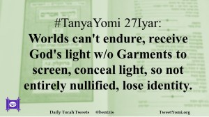 #TanyaYomi 27Iyar: Worlds can’t endure, receive God’s light w/o Garments to screen, conceal light, so not entirely nullified, lose identity.