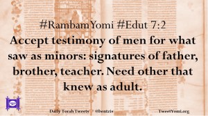 #RambamYomi #Edut 7:2 Accept testimony of men for what saw as minors: signatures of father, brother, teacher. Need other that knew as adult.