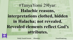 #TanyaYomi 29Iyar: Halachic reasons, interpretations clothed, hidden in Halacha; not revealed. Revealed elements reflect God’s attributes.