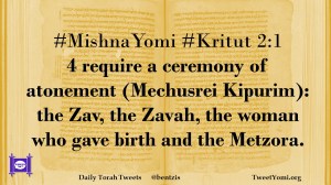 #MishnaYomi #Kritut 2:1 4 require a ceremony of atonement (Mechusrei Kipurim): the Zav, the Zavah, the woman who gave birth and the Metzora.