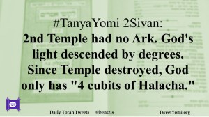 #TanyaYomi 2Sivan: 2nd Temple had no Ark. God’s light descended by degrees. Since Temple destroyed, God only has “4 cubits of Halacha.”