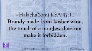HalachaYomi #HalachaYomi KSA 47:11 Date: May 26, 2020Author: ysspitz #HalachaYomi KSA 47:11 Brandy made from kosher wine, the touch of a non-Jew does not make it forbidden. Share this: Share on X (Opens in new window) X Share on Facebook (Opens in new window) Facebook Like Loading... Related