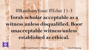 #RambamYomi #Edut 11:3 Torah scholar acceptable as a witness unless disqualified. Boor unacceptable witness unless established as ethical.