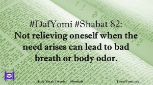 DafYomi, Shabat #DafYomi #Shabat 82 Date: May 27, 2020Author: ysspitz #DafYomi #Shabat 82: Not relieving oneself when the need arises can lead to bad breath or body odor. Share this: Share on X (Opens in new window) X Share on Facebook (Opens in new window) Facebook Like Loading... Related