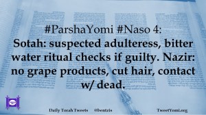 #ParshaYomi #Naso 4: Sotah: suspected adulteress, bitter water ritual checks if guilty. Nazir: no grape products, cut hair, contact w/ dead.