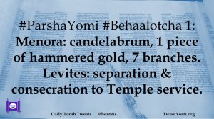 #ParshaYomi #Behaalotcha 1: Menora: candelabrum, 1 piece of hammered gold, 7 branches. Levites: separation & consecration to Temple service.
