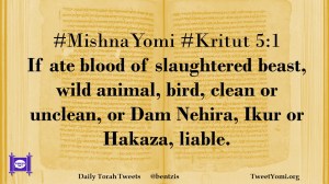 #MishnaYomi #Kritut 5:1 If ate blood of slaughtered beast, wild animal, bird, clean or unclean, or Dam Nehira, Ikur or Hakaza, liable.