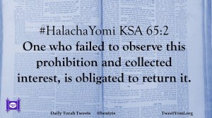 HalachaYomi #HalachaYomi KSA 65:2 Date: June 3, 2020Author: ysspitz #HalachaYomi KSA 65:2 One who failed to observe this prohibition and collected interest, is obligated to return it. Share this: Share on X (Opens in new window) X Share on Facebook (Opens in new window) Facebook Like Loading... Related