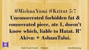 #MishnaYomi #Kritut 5:7 Unconsecrated forbidden fat & consecrated piece, ate 1, doesn’t know which, liable to Hatat. R’ Akiva: + AshamTalui.