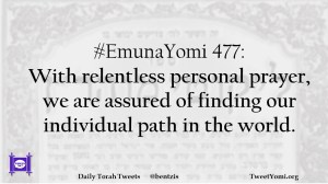 EmunaYomi #EmunaYomi 477 Date: June 8, 2020Author: ysspitz #EmunaYomi 477: With relentless personal prayer, we are assured of finding our individual path in the world. Share this: Share on X (Opens in new window) X Share on Facebook (Opens in new window) Facebook Like Loading... Related