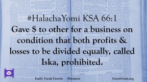#HalachaYomi KSA 66:1 Gave $ to other for a business on condition that both profits & losses to be divided equally, called Iska, prohibited.