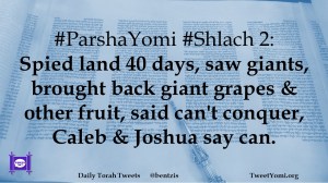 #ParshaYomi #Shlach 2: Spied land 40 days, saw giants, brought back giant grapes & other fruit, said can’t conquer, Caleb & Joshua say can.
