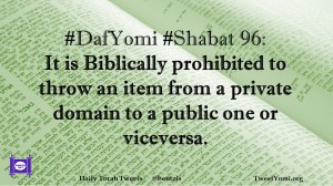 DafYomi, Shabat #DafYomi #Shabat 96 Date: June 10, 2020Author: ysspitz #DafYomi #Shabat 96: It is Biblically prohibited to throw an item from a private domain to a public one or viceversa. Share this: Share on X (Opens in new window) X Share on Facebook (Opens in new window) Facebook Like Loading... Related