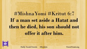 Kritut, MishnaYomi #MishnaYomi #Kritut 6:7 Date: June 10, 2020Author: ysspitz #MishnaYomi #Kritut 6:7 If a man set aside a Hatat and then he died, his son should not offer it after him. Share this: Share on X (Opens in new window) X Share on Facebook (Opens in new window) Facebook Like Loading... Related