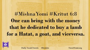 Kritut, MishnaYomi #MishnaYomi #Kritut 6:8 Date: June 10, 2020Author: ysspitz #MishnaYomi #Kritut 6:8 One can bring with the money that he dedicated to buy a lamb for a Hatat, a goat, and viceversa. Share this: Share on X (Opens in new window) X Share on Facebook (Opens in new window) Facebook Like Loading... Related