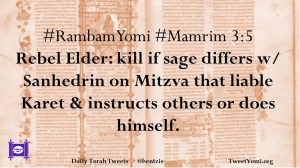 #RambamYomi #Mamrim 3:5 Rebel Elder: kill if sage differs w/ Sanhedrin on Mitzva that liable Karet & instructs others or does himself.