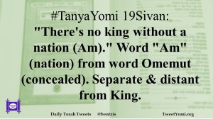 #TanyaYomi 19Sivan: “There’s no king without a nation (Am).” Word “Am” (nation) from word Omemut (concealed). Separate & distant from King.