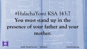 HalachaYomi #HalachaYomi KSA 143:7 Date: June 15, 2020Author: ysspitz #HalachaYomi KSA 143:7 You must stand up in the presence of your father and your mother. Share this: Share on X (Opens in new window) X Share on Facebook (Opens in new window) Facebook Like Loading... Related