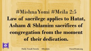 #MishnaYomi #Meila 2:5 Law of sacrilege applies to Hatat, Asham & Shlamim sacrifices of congregation from the moment of their dedication.
