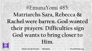#EmunaYomi 485: Matriarchs Sara, Rebecca & Rachel were barren. God wanted their prayers. Difficulties sign God wants to bring closer to Him.