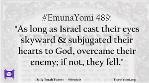 #EmunaYomi 489: “As long as Israel cast their eyes skyward & subjugated their hearts to God, overcame their enemy; if not, they fell.”