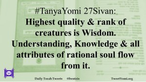 #TanyaYomi 27Sivan: Highest quality & rank of creatures is Wisdom. Understanding, Knowledge & all attributes of rational soul flow from it.