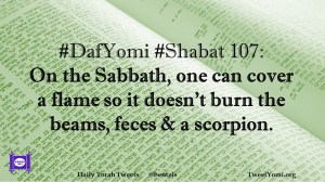 DafYomi, Shabat #DafYomi #Shabat 107 Date: June 21, 2020Author: ysspitz #DafYomi #Shabat 107: On the Sabbath, one can cover a flame so it doesn’t burn the beams, feces & a scorpion. Share this: Share on X (Opens in new window) X Share on Facebook (Opens in new window) Facebook Like Loading... Related