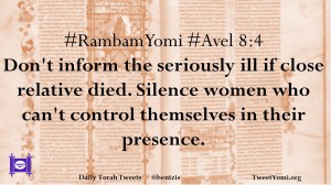 #RambamYomi #Avel 8:4 Don’t inform the seriously ill if close relative died. Silence women who can’t control themselves in their presence.