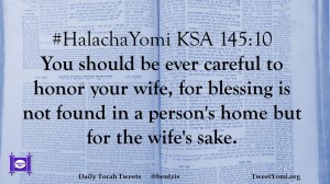 #HalachaYomi KSA 145:10 You should be ever careful to honor your wife, for blessing is not found in a person’s home but for the wife’s sake.
