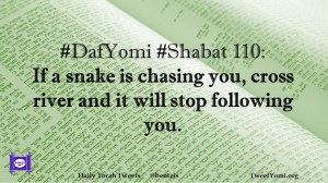 DafYomi, Shabat #DafYomi #Shabat 110 Date: June 25, 2020Author: ysspitz #DafYomi #Shabat 110: If a snake is chasing you, cross river and it will stop following you. Share this: Share on X (Opens in new window) X Share on Facebook (Opens in new window) Facebook Like Loading... Related