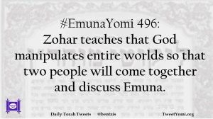 EmunaYomi #EmunaYomi 496 Date: June 26, 2020Author: ysspitz #EmunaYomi 496: Zohar teaches that God manipulates entire worlds so that two people will come together and discuss Emuna. Share this: Share on X (Opens in new window) X Share on Facebook (Opens in new window) Facebook Like Loading... Related