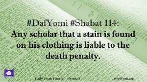 DafYomi, Shabat #DafYomi #Shabat 114 Date: June 29, 2020Author: ysspitz #DafYomi #Shabat 114: Any scholar that a stain is found on his clothing is liable to the death penalty. Share this: Share on X (Opens in new window) X Share on Facebook (Opens in new window) Facebook Like Loading... Related