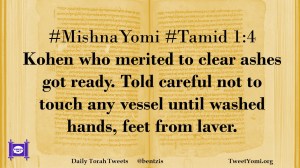 #MishnaYomi #Tamid 1:4 Kohen who merited to clear ashes got ready. Told careful not to touch any vessel until washed hands, feet from laver.