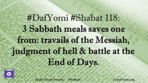 DafYomi, Shabat #DafYomi #Shabat 118 Date: July 3, 2020Author: ysspitz #DafYomi #Shabat 118: 3 Sabbath meals saves one from: travails of the Messiah, judgment of hell & battle at the End of Days. Share this: Share on X (Opens in new window) X Share on Facebook (Opens in new window) Facebook Like Loading... Related