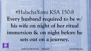 #HalachaYomi KSA 150:8 Every husband required to be w/ his wife on night of her ritual immersion & on night before he sets out on a journey.