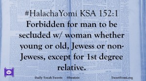 #HalachaYomi KSA 152:1 Forbidden for man to be secluded w/ woman whether young or old, Jewess or non-Jewess, except for 1st degree relative.
