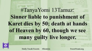 #TanyaYomi 13Tamuz: Sinner liable to punishment of Karet dies by 50; death at hands of Heaven by 60, though we see many guilty live longer.