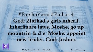 #ParshaYomi #Pinhas 4: God: Zlofhad’s girls inherit. Inheritance laws. Moshe, go up mountain & die. Moshe: appoint new leader. God: Joshua.